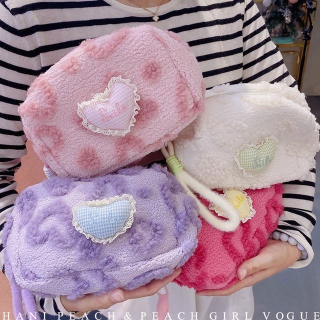 韓国雑貨♥︎もこもこ ハート ボアポーチ / 大容量 ストラップ付き 化粧ポーチ・小物入れ・トラベル メイクポーチ マルチポーチ ギフト雑貨 高校生 大学生 入学祝い インスタ映え